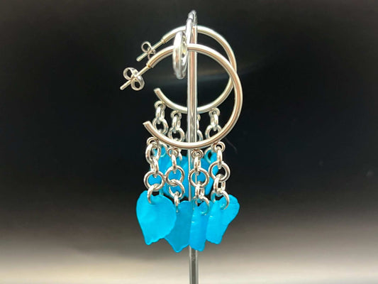 Stainless Steel Blue Elven Leaf Leaf Accented Chainmaille Hoop Earrings Measuring Approx. 2.5" Long