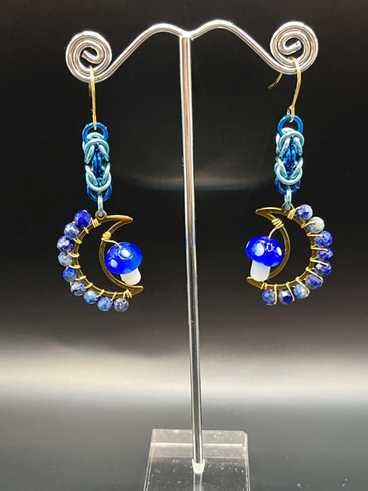 Blue Lapis Lazuli-Accented Mushroom Moon Chainmaille Earrings Measuring Approx. 2.75" Long