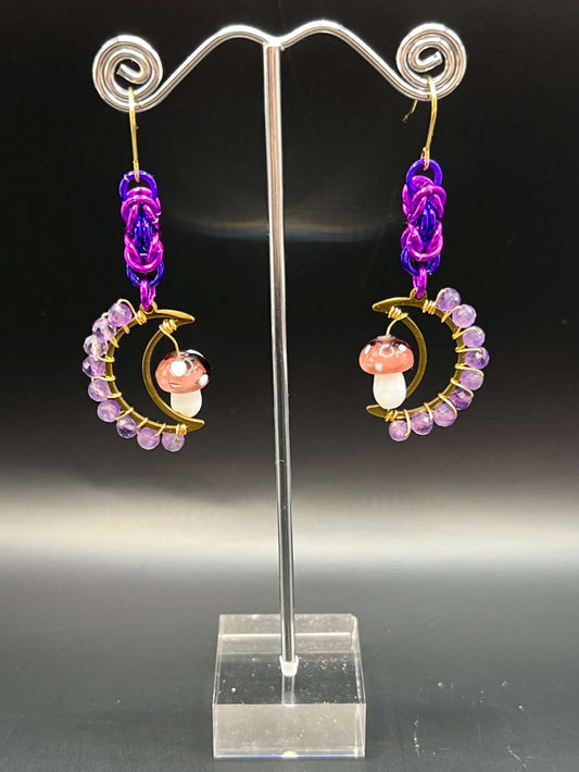 Purple Amethyst-Accented Mushroom Moon Chainmaille Earrings Measuring Approx. 2.75" Long