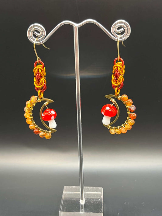 Red Carnelian-Accented Mushroom Moon Chainmaille Earrings Measuring Approx. 2.75" Long