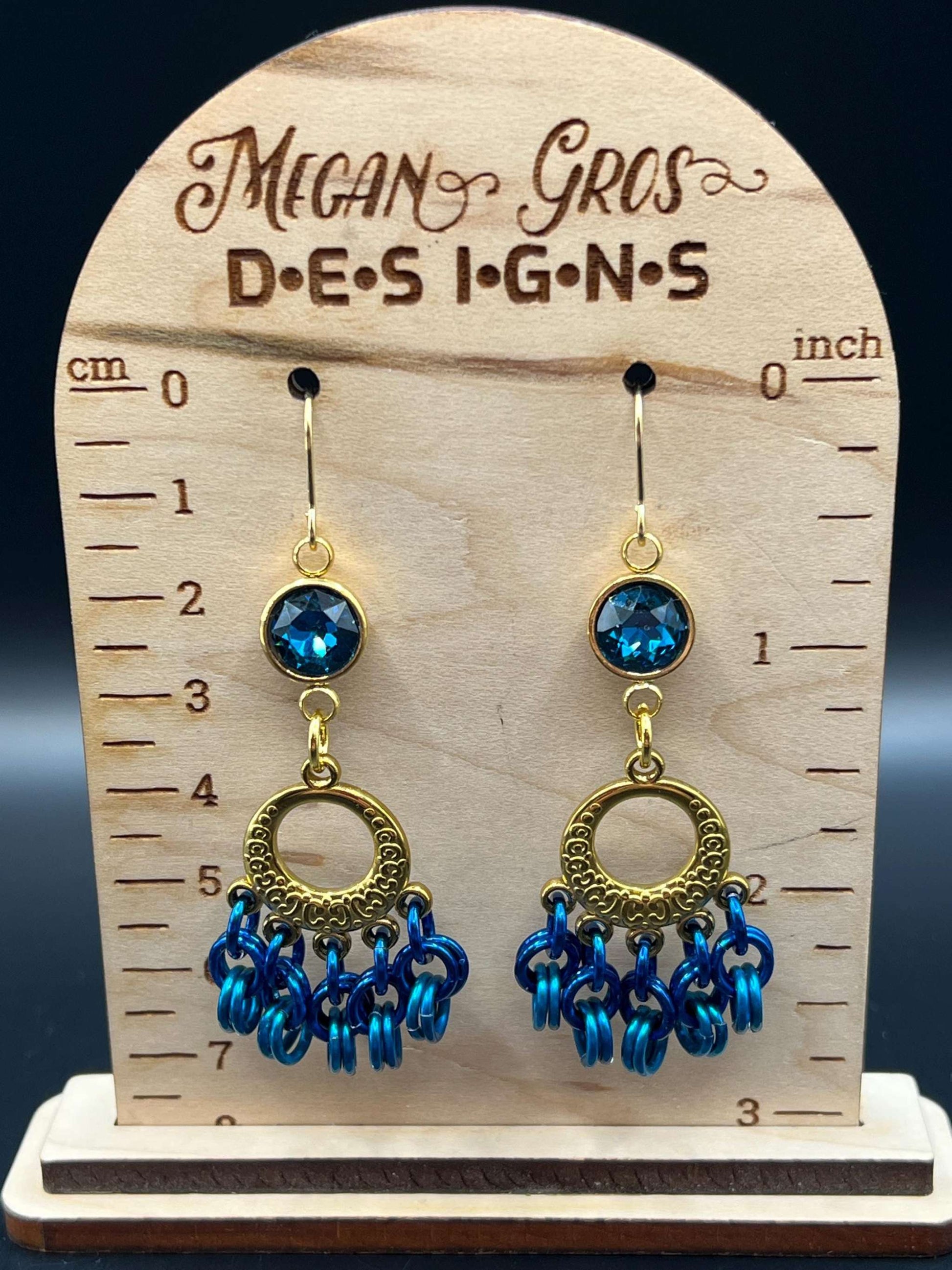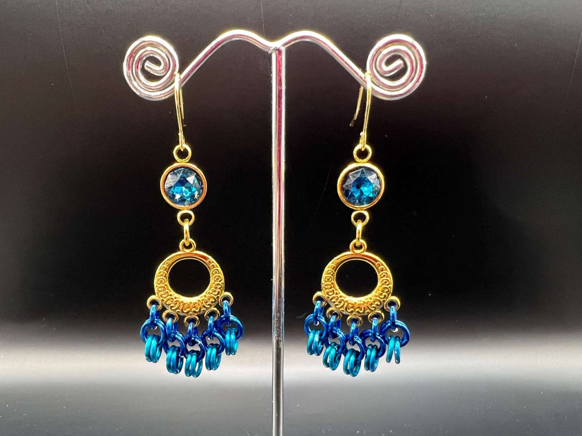 Blue & Gold Chainmaille Chandelier Earrings with Glass Gems, Surgical Steel Hooks, Earrings Measure Approx. 2.75" Long Inc. Hooks