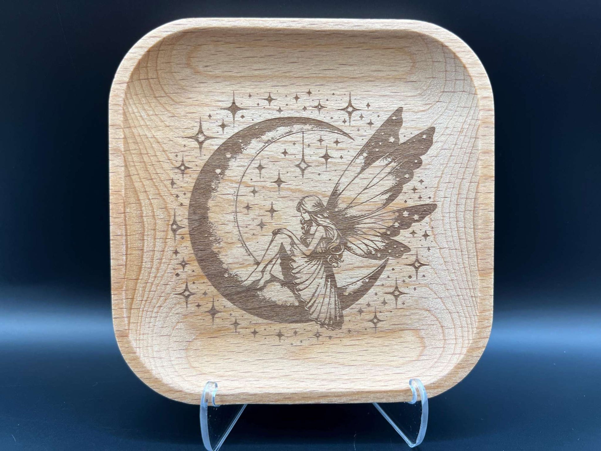 Crescent Moon Fairy Laser Engraved Wood Trinket Tray Measuring Approx. 5" in Diameter. Jewellery Storage, Decorative Tray