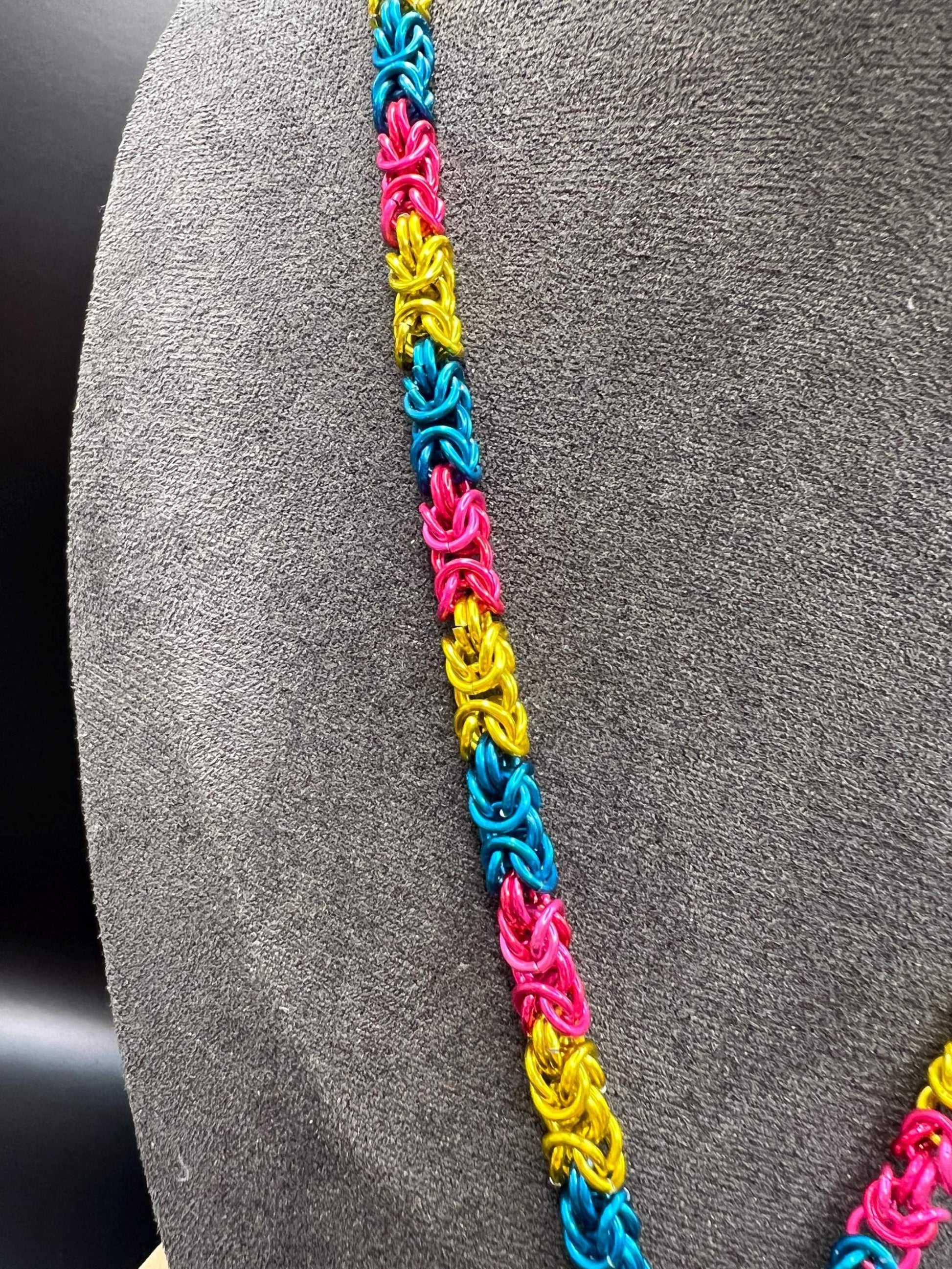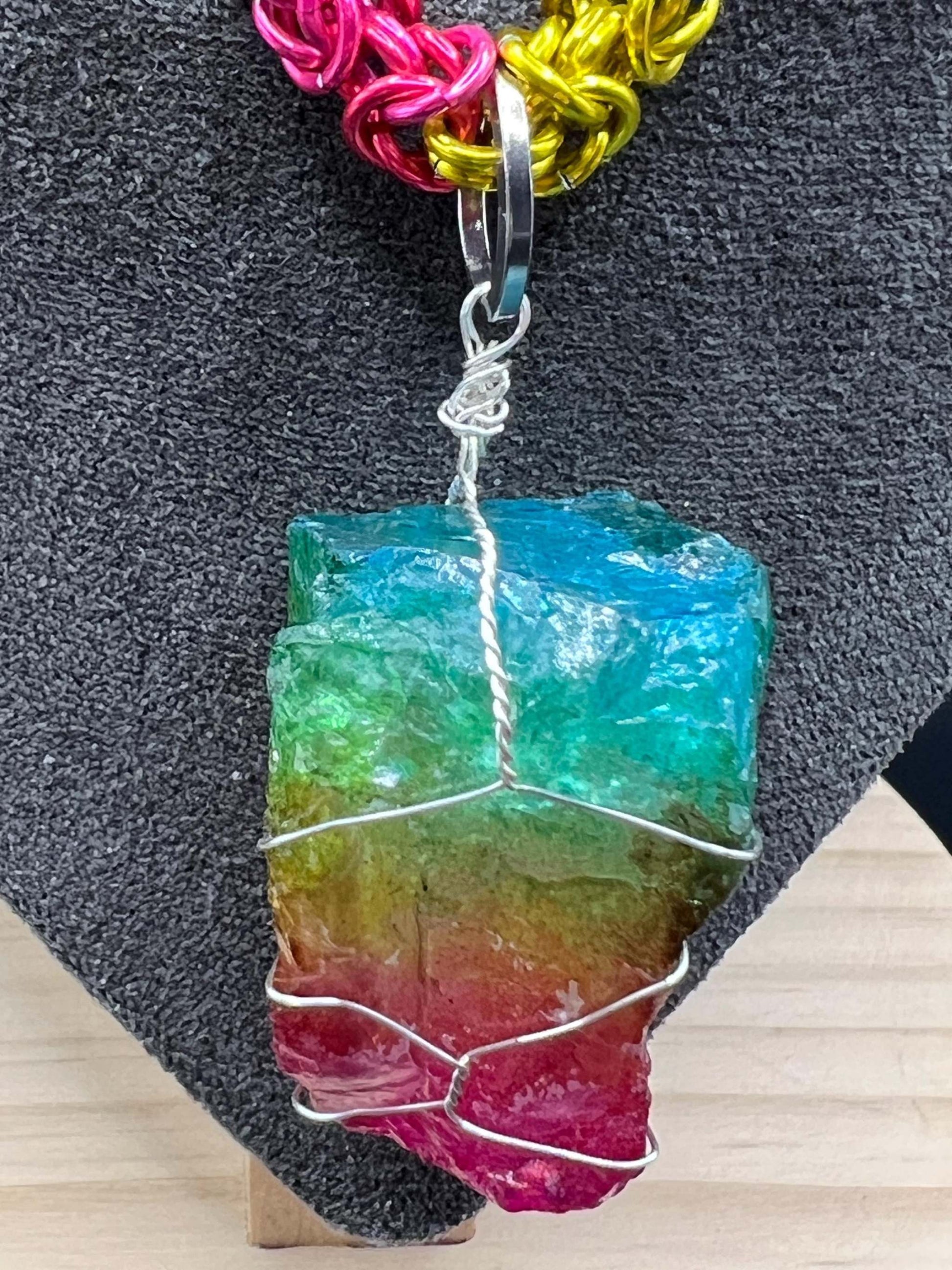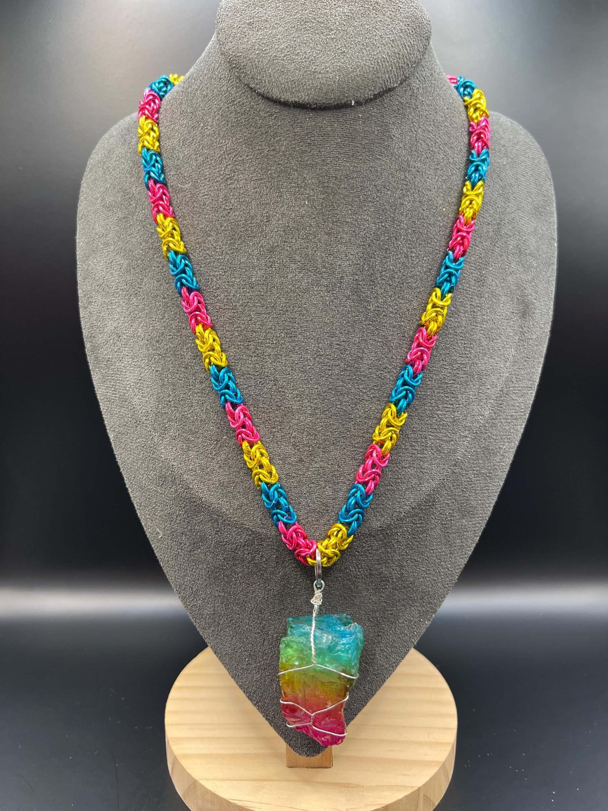 Dyed Quartz Pendant in Green, Yellow & Pink Chainmaille Necklace, Petite Byzantine, Anodized Aluminum, Measures Approx. 19.5-21" Long