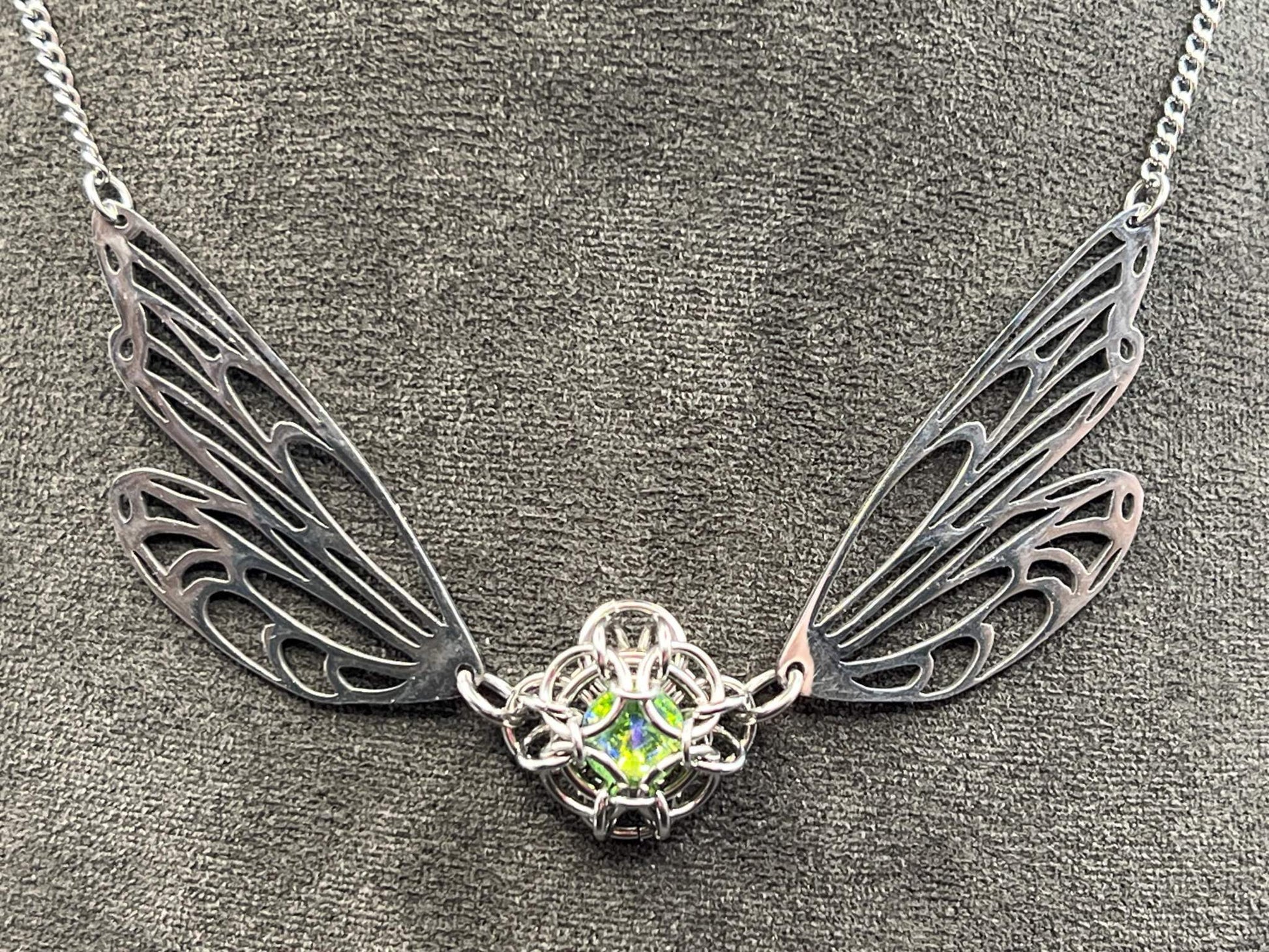 Fantasy-Inspired Butterfly Wing Necklace with GREEN Glass Gem, Solid Stainless Steel Chainmaille Pendant, Necklace Measures Approx. 20" Long
