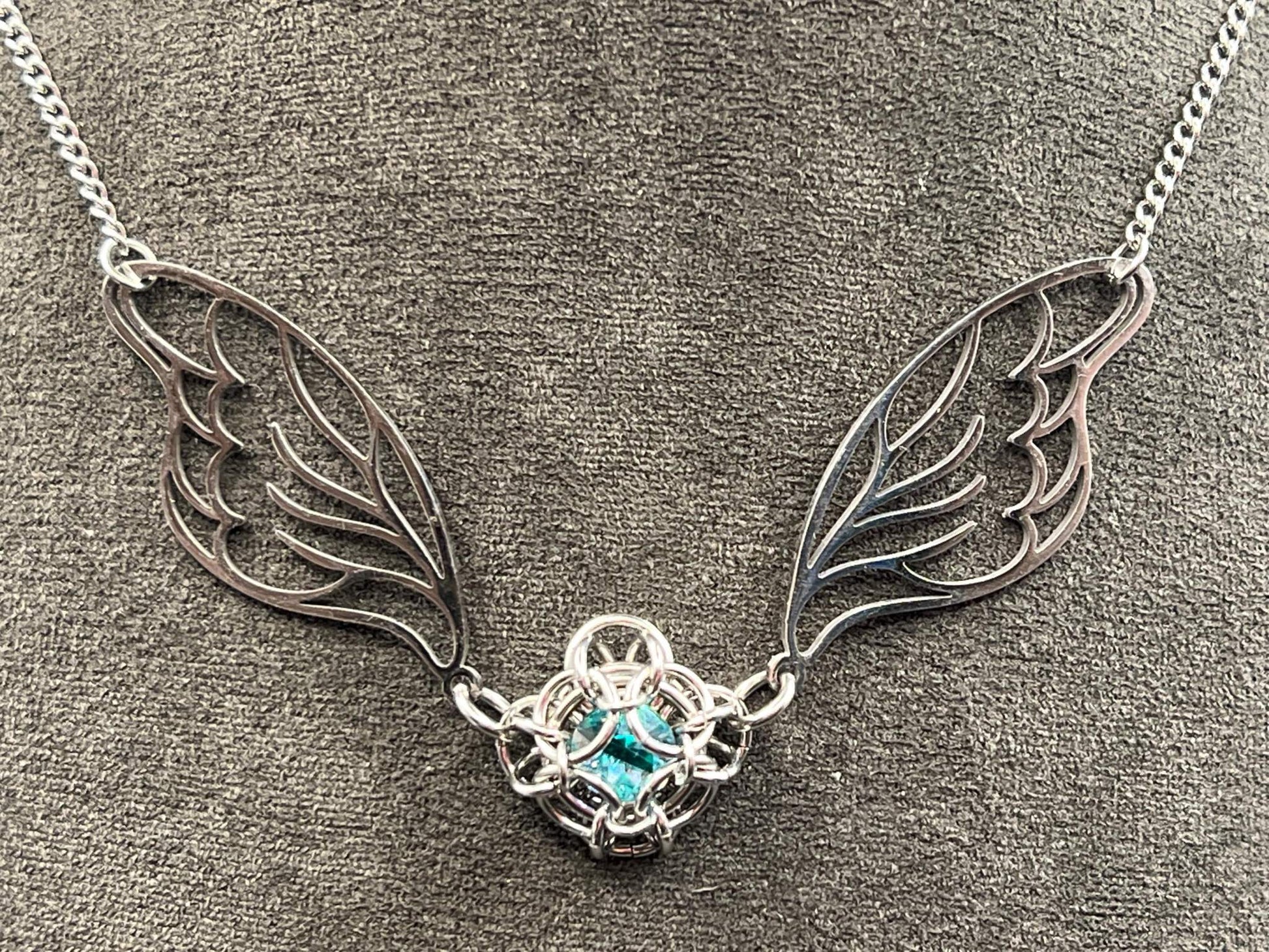 Fantasy-Inspired Fairy Wing Necklace with BLUE Glass Gem, Solid Stainless Steel Chainmaille Pendant, Necklace Measures Approx. 20" Long