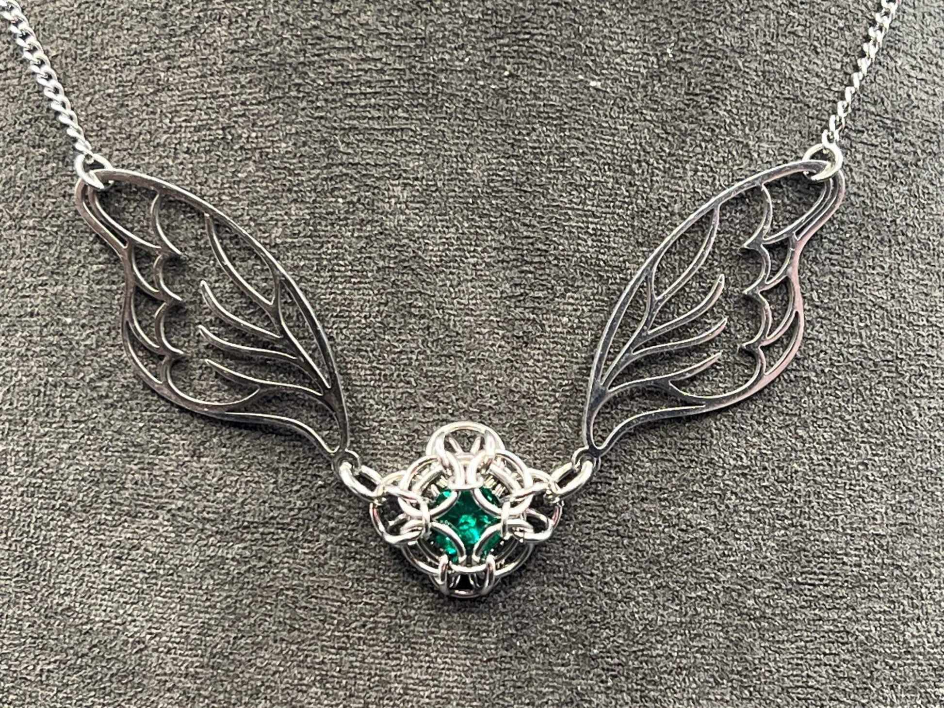 Fantasy-Inspired Fairy Wing Necklace with GREEN Glass Gem, Solid Stainless Steel Chainmaille Pendant, Necklace Measures Approx. 20" Long