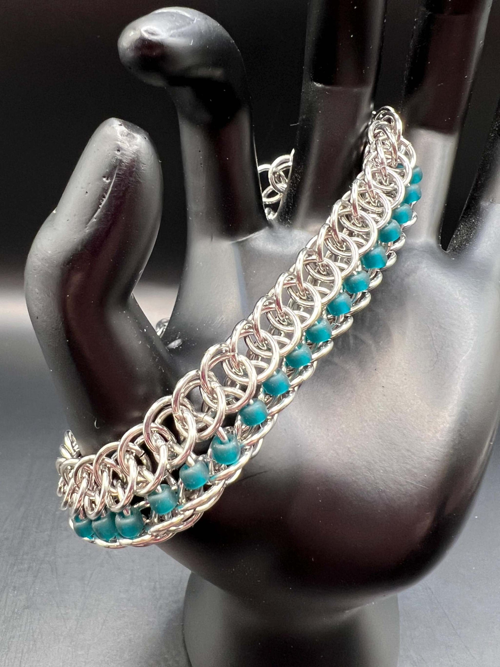 Glass Beaded Alligator Back Solid Stainless Steel Bracelet, Chainmaille, Stainless Steel Lobster Clasp, Adjustable 8.25-9.5" Long