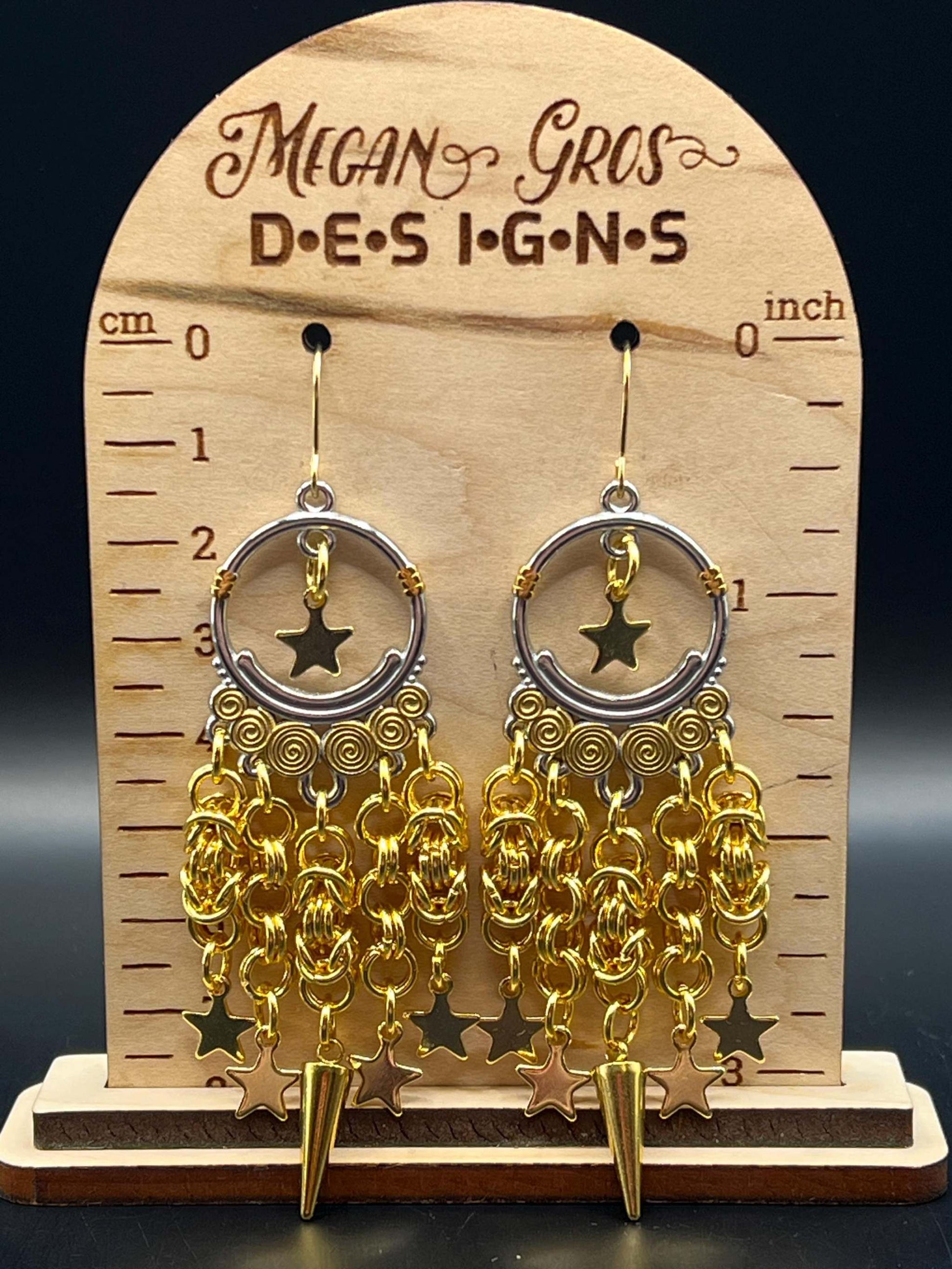 Gold & Silver Chainmaille Chandelier Earrings with Stars, Surgical Steel Hooks, Earrings Measure Approx. 3.5" Long Inc. Hooks