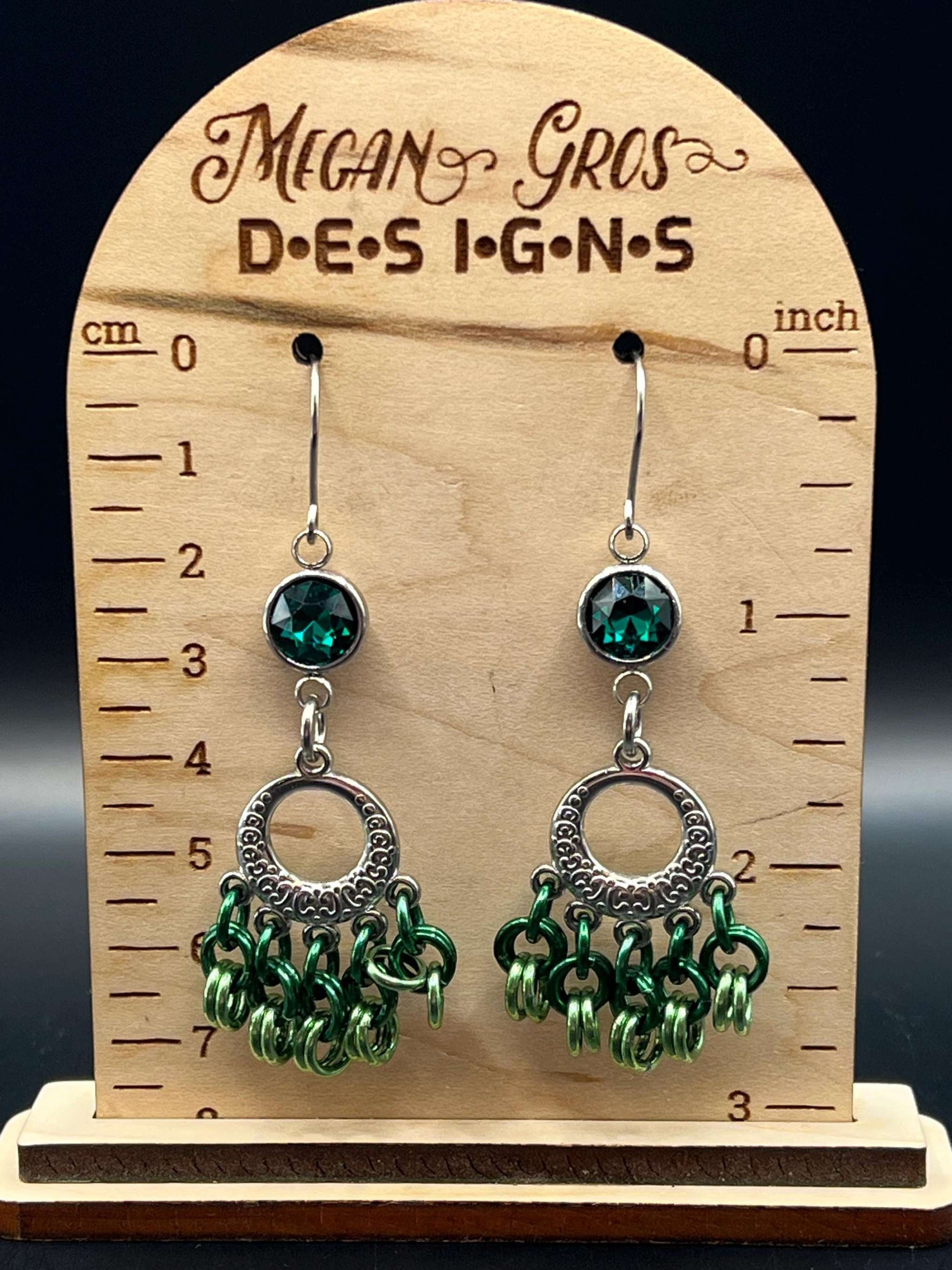 Green & Silver Chainmaille Chandelier Earrings with Glass Gems, Surgical Steel Hooks, Earrings Measure Approx. 2.75" Long Inc. Hooks