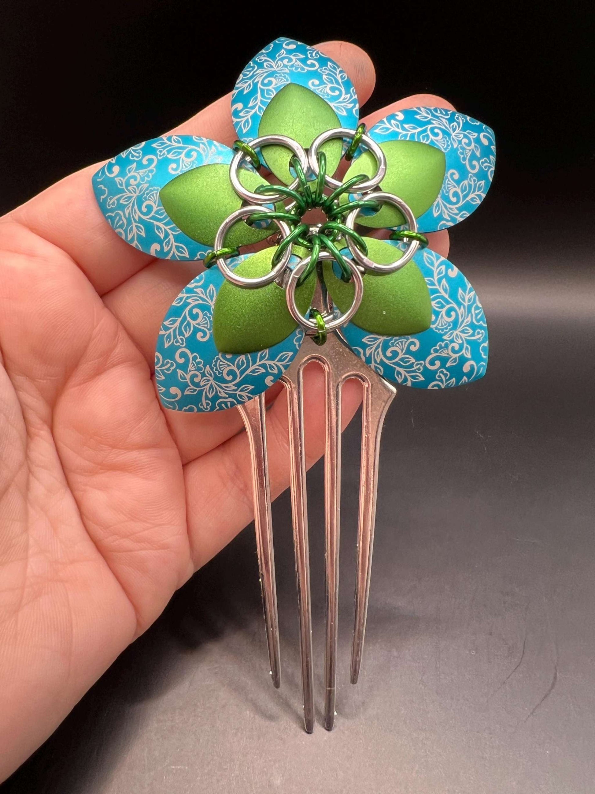 This comb measures approx. 5" long from the top of the flower to the bottom of the comb. The scales and rings used here are anodized aluminum, and the comb is an alloy metal.