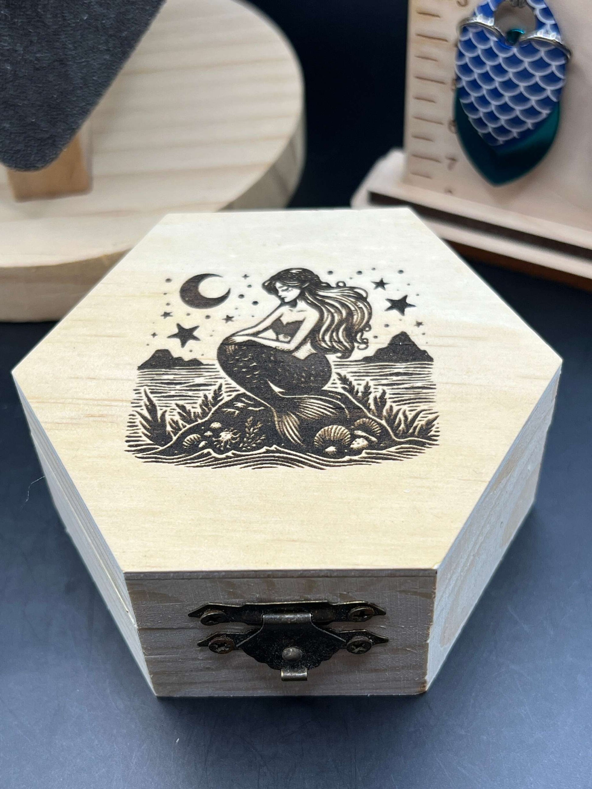 Mermaid-Themed Scalemaille Jewellery Gift Set in Laser Engraved Wooden Box - Includes Pendant (2.5"), Earrings (2.75") and Box