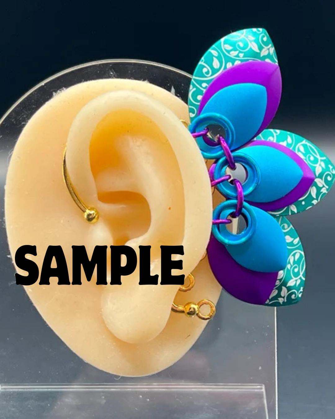Ear cuff findings are made of plated alloy materials. The scales and rings used for these are anodized aluminum, and I engraved the scales myself!